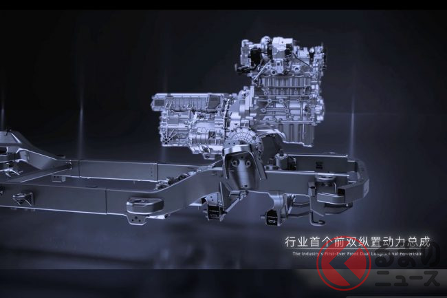 これに自社開発のPHEV専用エンジンを縦置きで配置、前後のアクスルにモーターを備え付けたシリーズパラレル式ハイブリッドとなります。