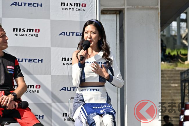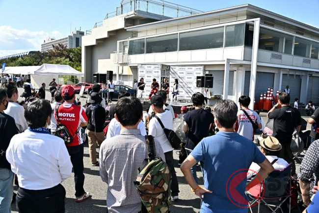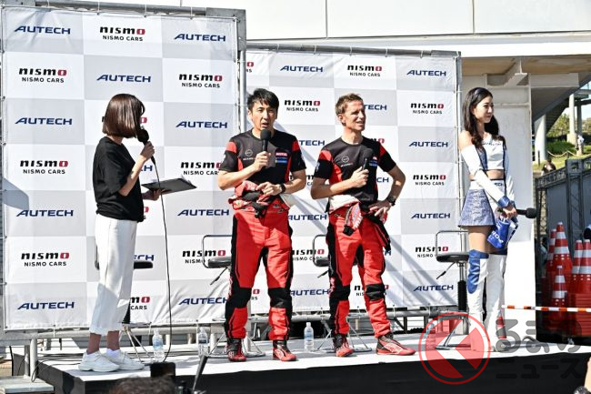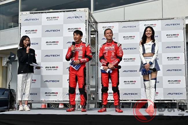 ミーティングでは、NMCの片桐CEOから挨拶があり、スペシャルゲストの「スーパーGT GT500 23号車 MOTUL AUTECH Z」のドライバーとなる松田次生/ロニー・クインタレッリの両ドライバー、2023年AUTECHレースクイーンの高岡みほさんが登場しました。