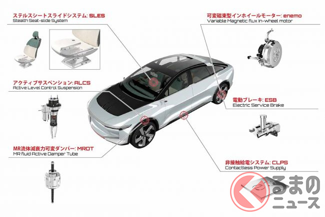 プラットフォームは、リアにTHK独自開発の93kW(800V仕様)の可変磁束型インホイールモーター2基、フロントに220kW(800V仕様)のモーター1基を搭載した4輪ステア機構を採用。