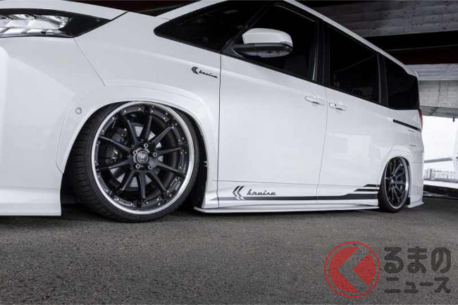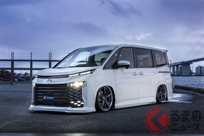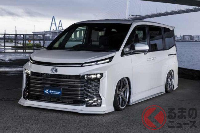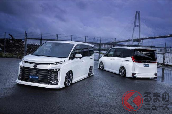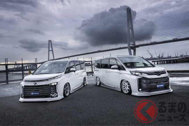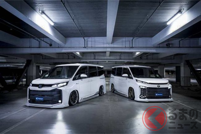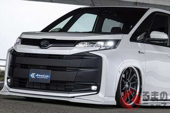 トヨタ「ノア/ヴォクシー」の“ド迫力仕様”公開! ギラ感抑えめでスッキリ! シャコタンな凄顔ミニバンに「追加パーツ」登場