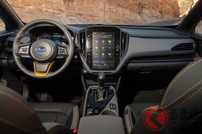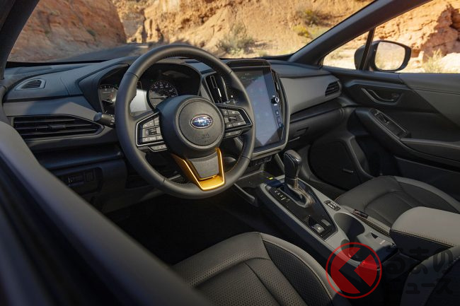 さらに、フロントドアとリアゲートに「SUBARU WILDERNESS」のバッジを装着。ボディ同色のルーフスポイラーやイエローのアクセント、ウインカー内蔵のブラックのサイドミラー、専用デザインのホイールなどが“オフロードSUV感”を引き立てます。