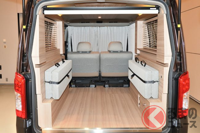天井にはスポット照明付きの木目調ルーフパネルが備わり、後部の窓にはウッドブラインドも装着され、まさに「部屋」そのものといった雰囲気です。