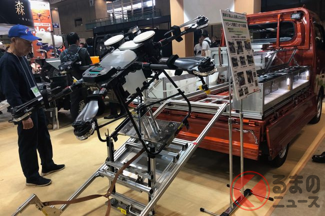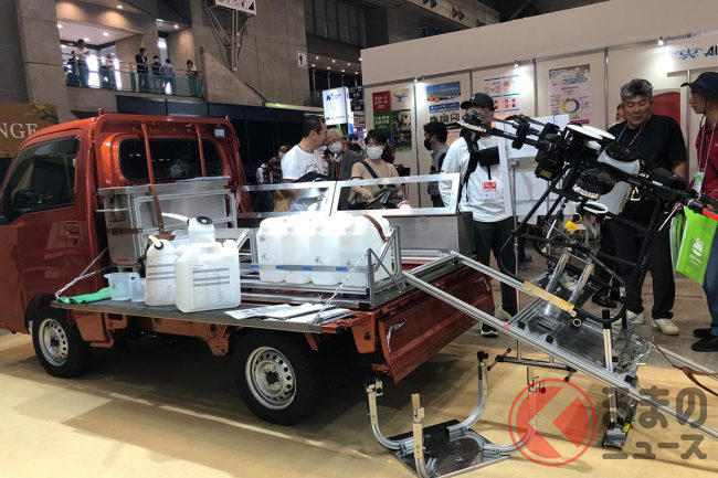 次に、ダイハツの展示を見ると、「ハイゼット トラック」に農薬散布のための農業用ドローンが積み込まれる様子を再現していました。