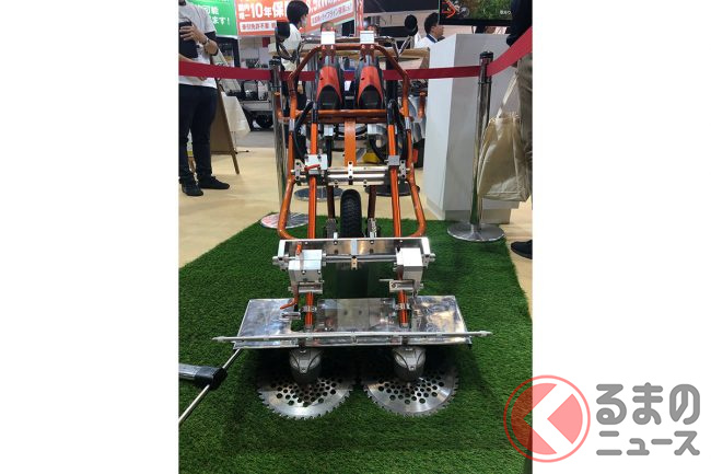もうひとつの展示は、電動の刈払機(かりばらいき)です。特徴はふたつ機器を手押し車のような操作で使えること。