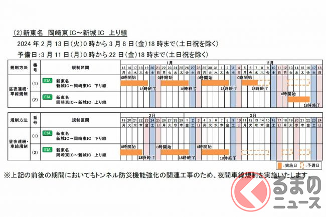 新東名高速で、トンネル防災工事のため、2024年1月から3月にかけて一部区間で昼夜連続の車線規制が計画されています。