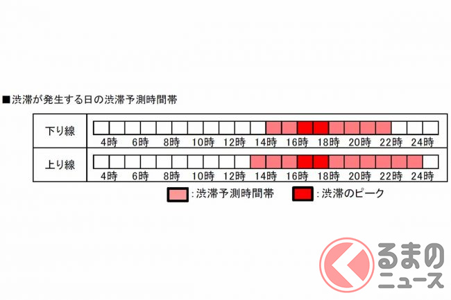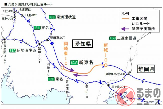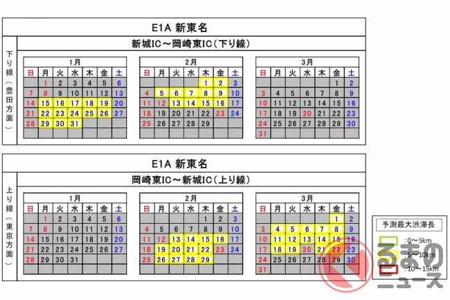 車線規制の影響で、新城IC~岡崎東IC間は、午後に下りで最大8km、上りで最大5kmの渋滞が予測されています。ピークは夕方です。