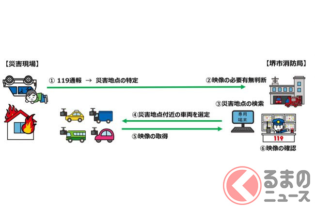 同システムは、消防指令センターのオペレーターが、119番通報だけでは把握しきれない現場の状況をより正確に把握するために、選択した付近を走行する車両からの映像を閲覧できるようにするもの。