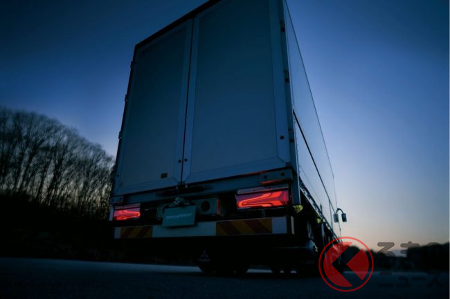 これに続く形で今回新たに公開された画像では、レッドメタリックのキャブ本体に後部がアルミバンのような箱を組み合わせていることが確認でき、大型トラックであることが初めて明らかになりました。