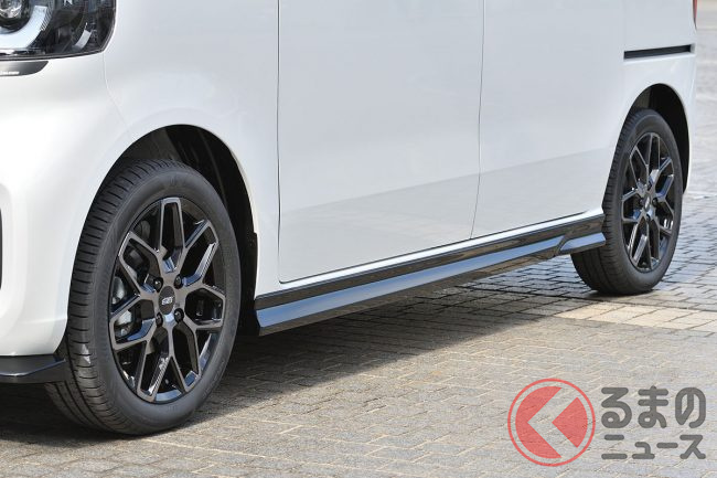 サイドスポイラーを装着することで、標準装着のサイドシルガーニッシュより、新型N-BOXカスタムは25mmダウン、N-BOX は35mmダウンします。