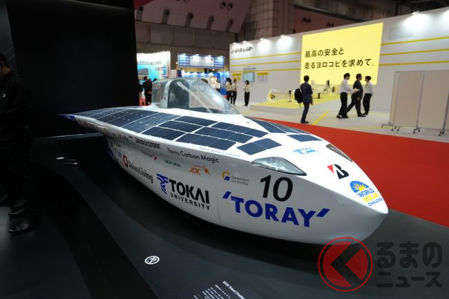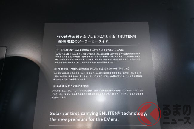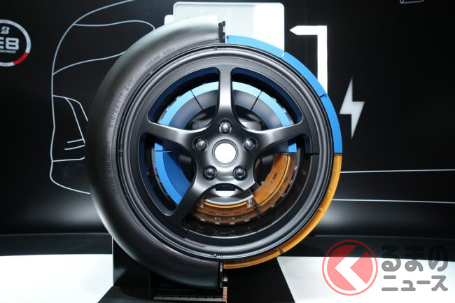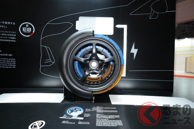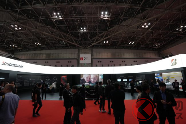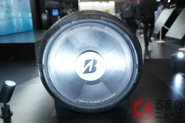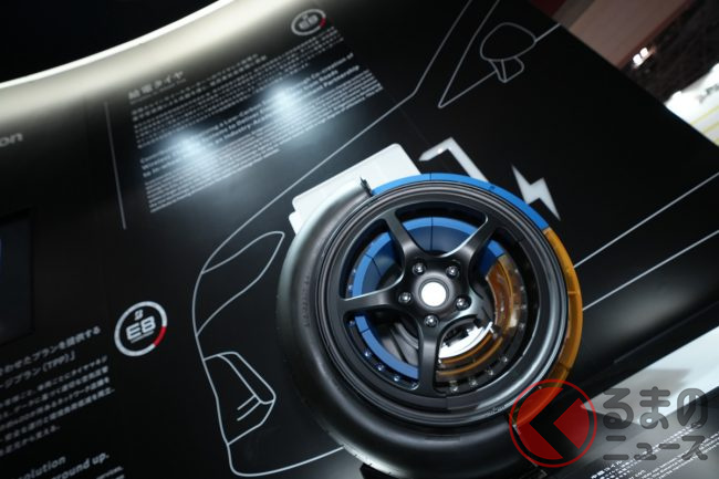 ブリヂストンは、東京ビッグサイトで10月26日から11月5日(一般公開は10月28日から)に開催されている「ジャパンモビリティショー2023」において、同社が特に力をいれている、環境性能と運動性能を両立するタイヤ技術「ENLITEN(エンライトン)」を採用した海外市場向けタイヤや、電気自動車の航続距離を伸ばすための技術である「給電タイヤ」などを展示しています。報道陣向けに公開された10月25日、ブースを訪ねてみました。