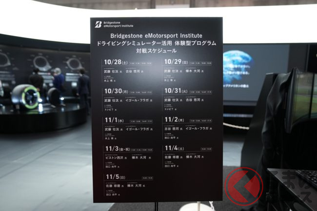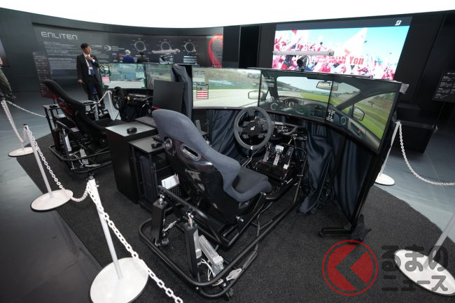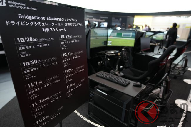 来場客にゆったりと見てもらえるように広く作ったというブースは、中央にドライビングシミュレーターを配置。プロレーシングドライバー同士のレース対決を見せるというイベントをジャパンモビリティショー期間中に実施する予定です。