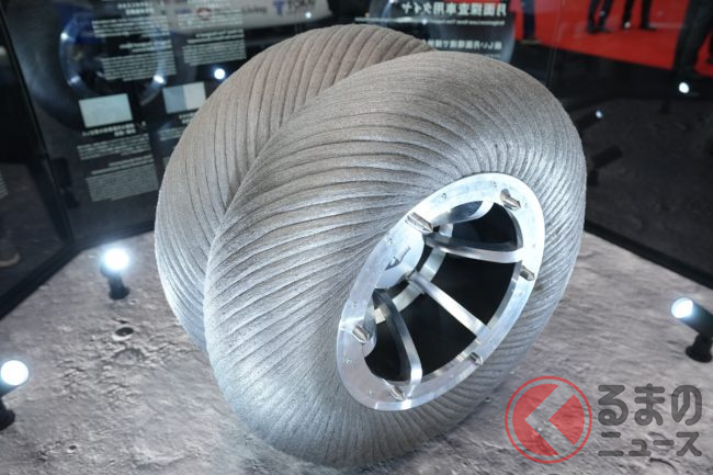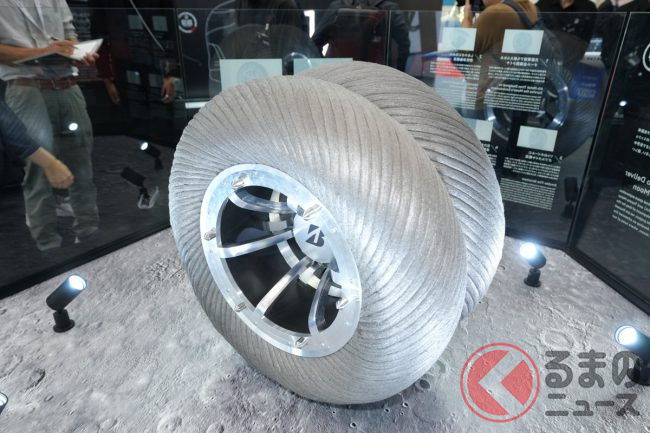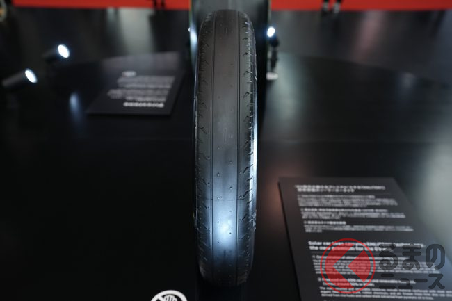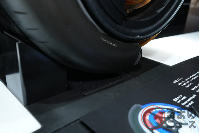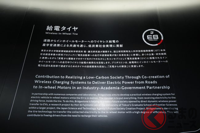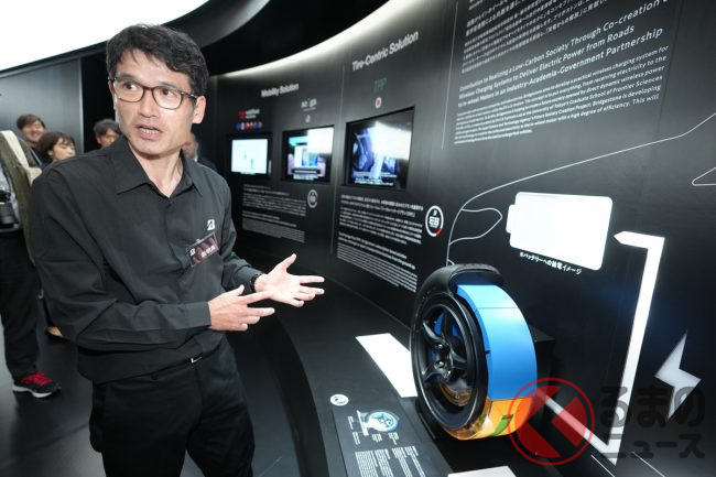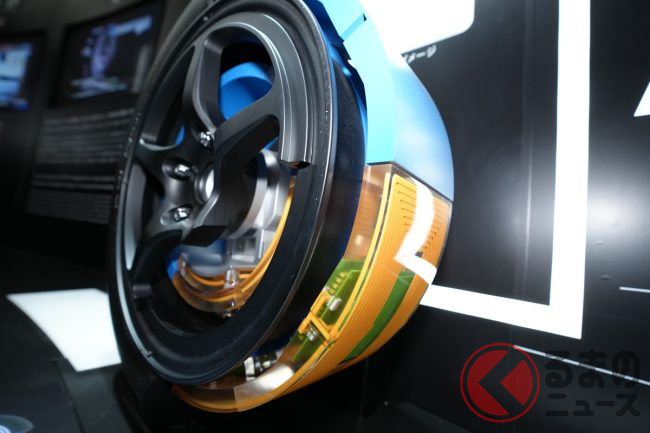 同社ブースの担当者は「日本中で、信号の手前30mくらいの路面に給電コイルが設置されれば、必要十分な給電が可能です。高速道路などでも通常の速度であれば、問題なく給電できます」と解説。なお、従来のタイヤ内にはスチールベルトが配置されていますが、給電の支障となるため、特別な有機ベルト素材を使用しているとのことです。