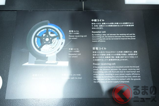 また、昨今話題となっている給電タイヤの出展もありました。これは、EVの航続距離を伸ばすための解決策で、道路に給電コイルを配置し、その電力をタイヤ内にあるコイルが受電して車両に給電するという仕組みのものです。