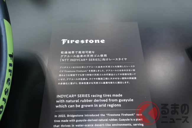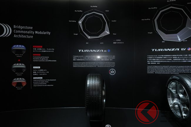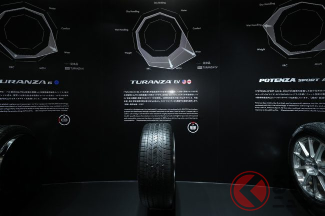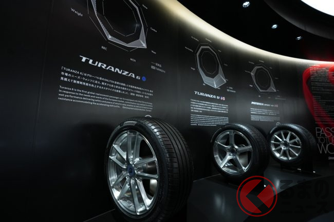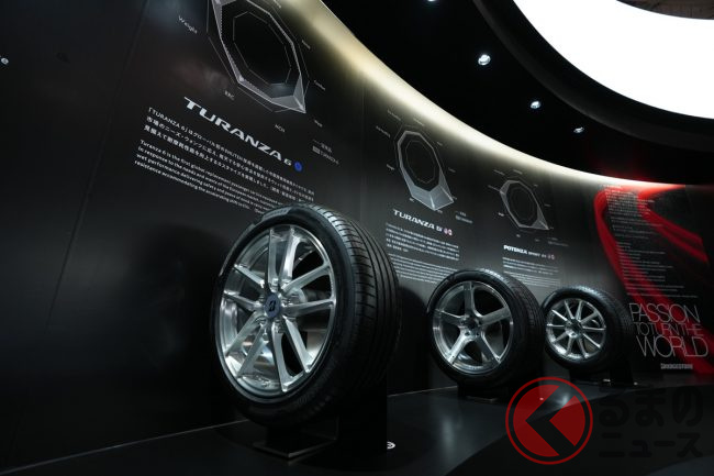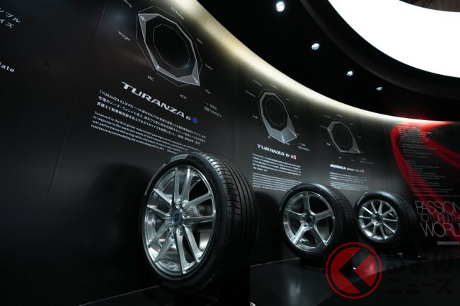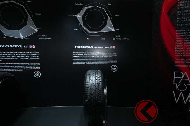 ブース左手には、海外で販売しているタイヤ「TURANZA(トランザ)」「TURANZA EV(トランザ イーブイ)」「POTENZA SPORT AS(ポテンザ エーエス)」を展示。これらのタイヤは環境性能と運動性能を両立する同社のタイヤ技術「ENLITEN(エンライトン)」が採用されています。これらの技術を用いたタイヤは現在日本では販売されていないものの、近く日本でもお目見えするかもしれません。