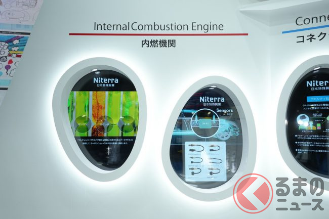 同ブースでは、現在のクルマにおけるスパークプラグや各種センサーに加え、長年の歴史で培ったセラミック技術を活用した、未来のクルマで期待される製品たちを「内燃機関」「安全安心」「コネクテッド」「次世代」という4つのカテゴリに分けて展示。