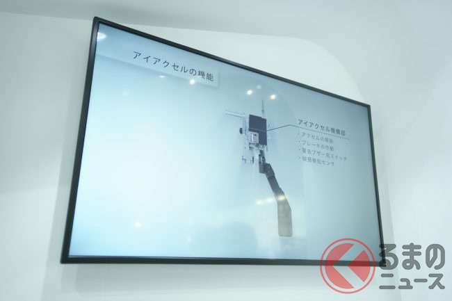 なかでも、「アイアクセル」という、アクセルとブレーキの踏み間違い防止装置は、「車を手放せない地方の皆さんに向けた商品で、昨今、アクセルとブレーキの踏み間違いによる事故が多発していることを受けて製品化したものです」とブース担当者は説明していました。