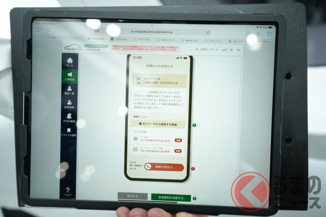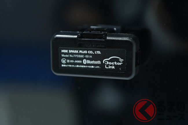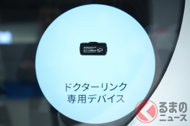 整備工場向けコネクテッドサービスの「ドクターリンク」は、アフターパーツとして取り付けるもので、専用デバイスを自動車のOBD端子に接続し、アプリを入れた携帯とBluetoothで接続。車速などから走行距離を認識し、整備工場などにその情報が伝わり、得られた情報をもとに整備工場が整備案内などをユーザーの携帯電話へプッシュ通知するというものです。