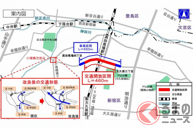 また、開通区間の西側にある小滝橋交差点では、これまで禁止されていた、諏訪通りから早稲田通り落合・中野方面への直進が可能になります。