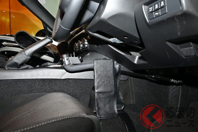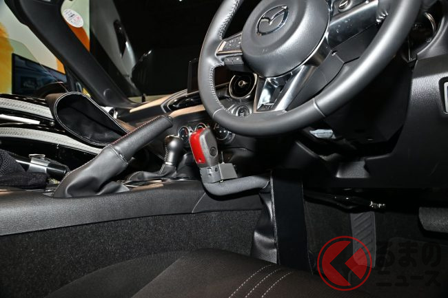今回JMS2023のマツダブースに展示されていたロードスターは、たとえ下肢に障がいを持つ人であってもクルマを運転することができる装置が搭載されたもので、同車は左右片方あるいは両方の脚を使用せずとも、両手のみでクルマの運転に必要な操作が可能となっています。