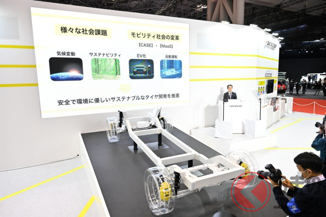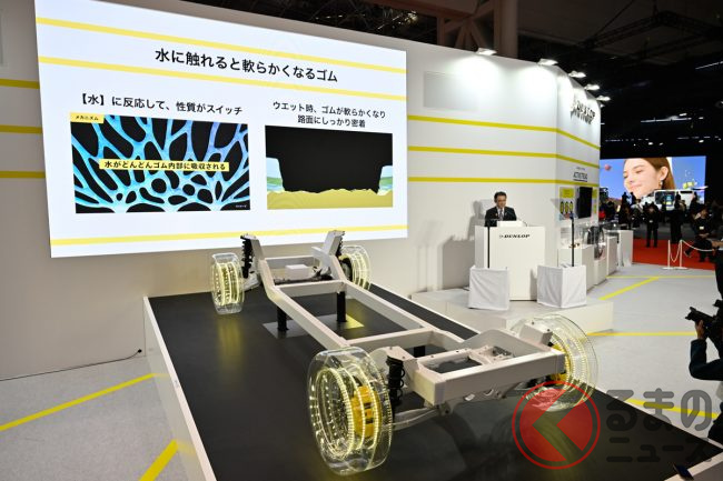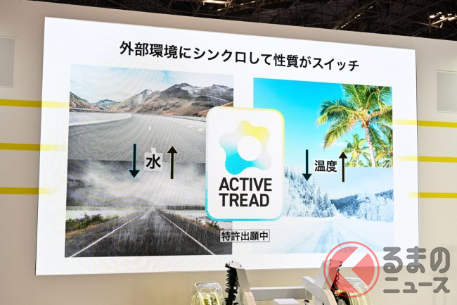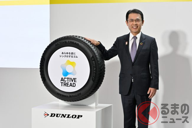 住友ゴム工業は、東京ビッグサイト(東京都江東区)で開催中の「ジャパンモビリティショー2023」にダンロップブランドでブースを出展し、2023年10月26日に行われたプレスカンファレンスで、水や温度といった外部環境にシンクロして性能がスイッチする新発明のゴム技術である「アクティブトレッド」を採用した次世代オールシーズンタイヤを、2024年秋に発売すると発表しました。