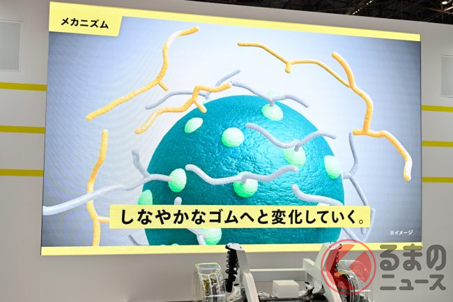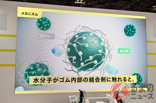 また新技術の詳細について山本氏は「『アクティブトレッド』のポイントは『水に触れると軟らかくなる』と『低温で軟らかくなる』の2点。タイヤはぬれた路面で滑りやすくなるため、従来、水は排除すべき邪魔者と考えていたが、この水を味方につけることはできないかと発想を転換した。水に反応して分子レベルの結合が離れることで性質がスイッチし、しなやかなゴムへと変化。路面にしっかりと密着することでグリップ性能が向上し、ぬれた路面でも安心して走れるようになった。また、温度が低くなるとゴムは硬くなり路面には密着しにくくなるが、凍った路面でのみ軟らかくなるゴムはできないかと常識を覆す材料を模索してきた結果、画期的な新素材に出合うことができた。この新素材と当社が培ってきたゴム材料技術を融合することで、低温でもゴムが軟らかく路面に密着し、冬の氷上でも安心なドライブの実現を目指している」と説明しました。