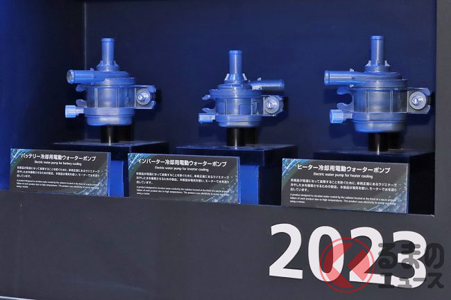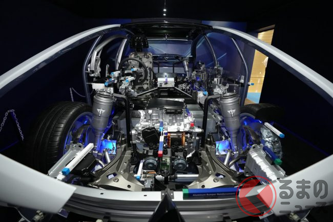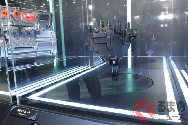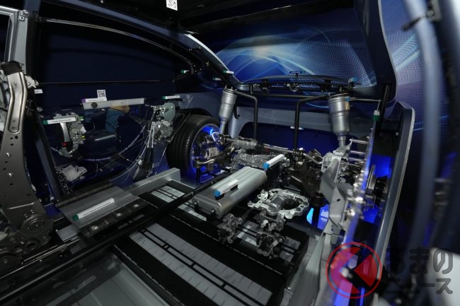 「『電動化』でかわるクルマづくり」では、同社は次世代パワートレインeAxleを始め、熱マネジメントシステム、アルミ電池骨格、ギガキャスト、回生協調ブレーキや空力デバイスなど、クルマ全体にわたる多くの電動化製品を取りそろえているとして、これらの小型・軽量化、高効率化を進めるとともに、システムを統合制御することにより、BEVの航続性能、走りの楽しさや安全性を一段と向上させるとしています。