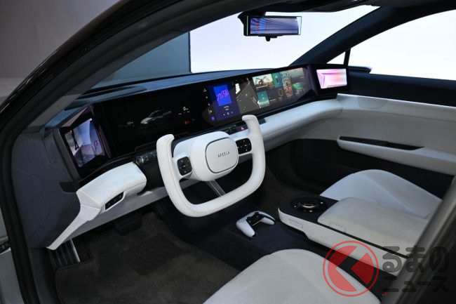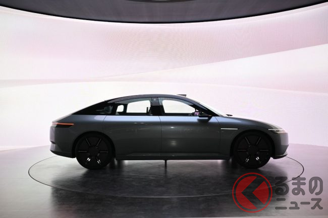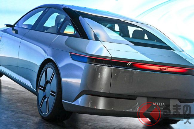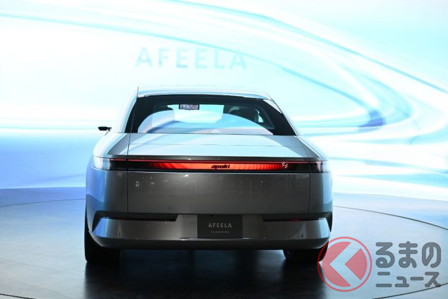 ソニー・ホンダが新型「セダン」初公開! 斬新ハンドル&デザイン採用! 2026年発売の「アフィーラ」実車展示