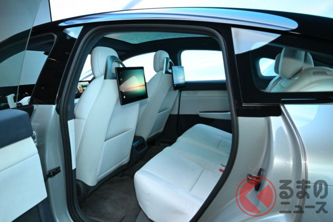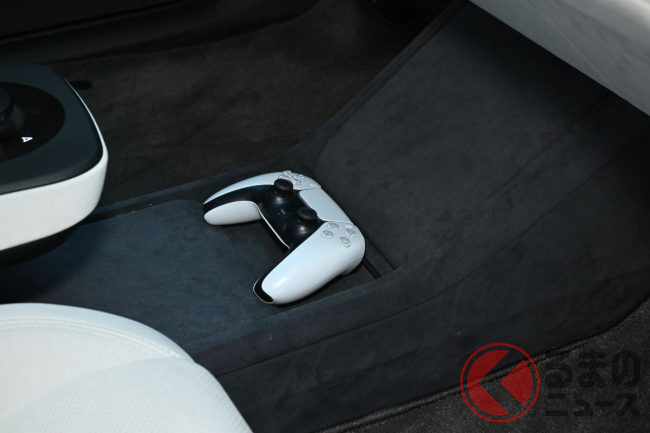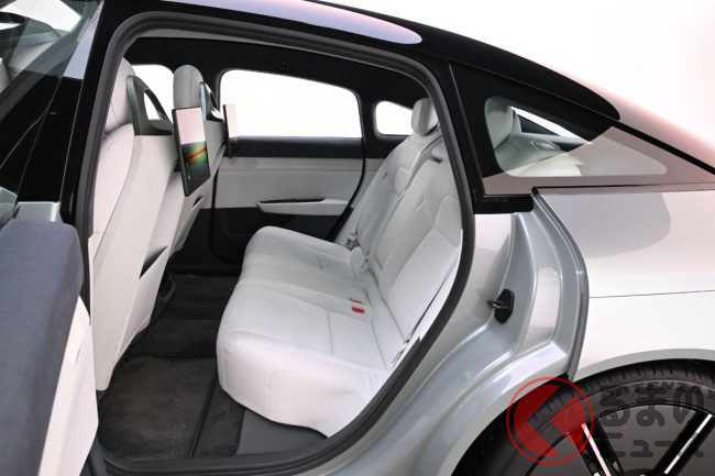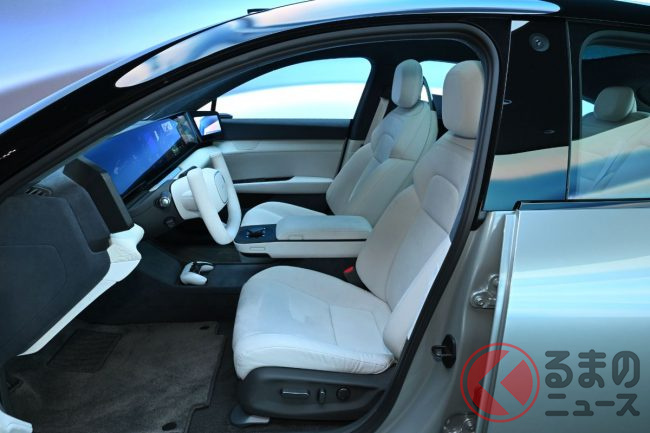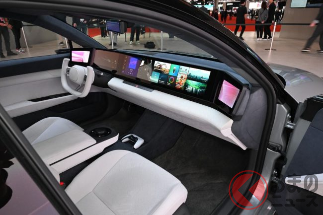 インテリアは、ダッシュボード上に横長3枚、電子ドアミラーの表示を含めると5枚のモニターが並び、最新のEVらしい近未来的な雰囲気となっています。ここでは音楽や映画、またプレイステーション5のゲームも楽しめるといいます。