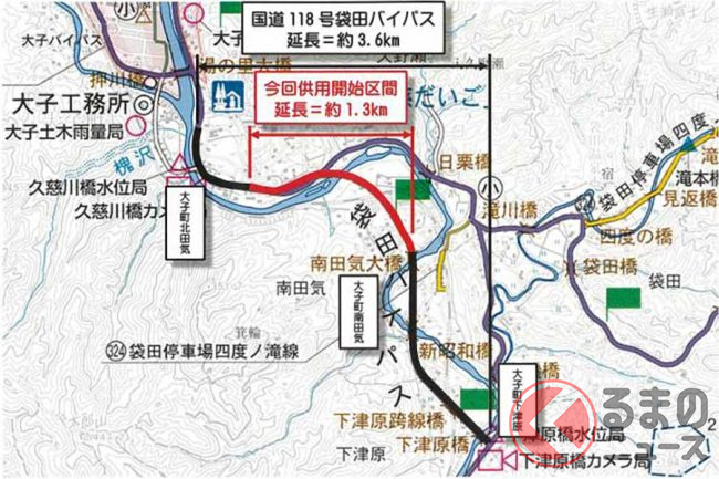 これにより袋田バイパスの全線がつながり、渋滞ポイントとなっている袋田の滝入口交差点を避けたルートが完成します。