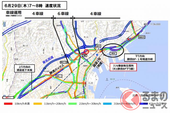 全線が4車線(片側2車線)で開通していますが、東名高速の清水ICと接続する前後の区間だけは信号のある交差点が残っており、クルマの流れを悪化させています。
