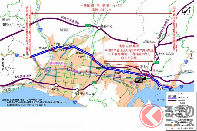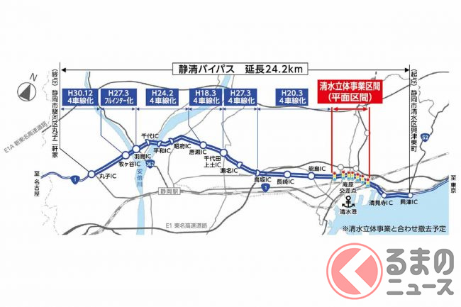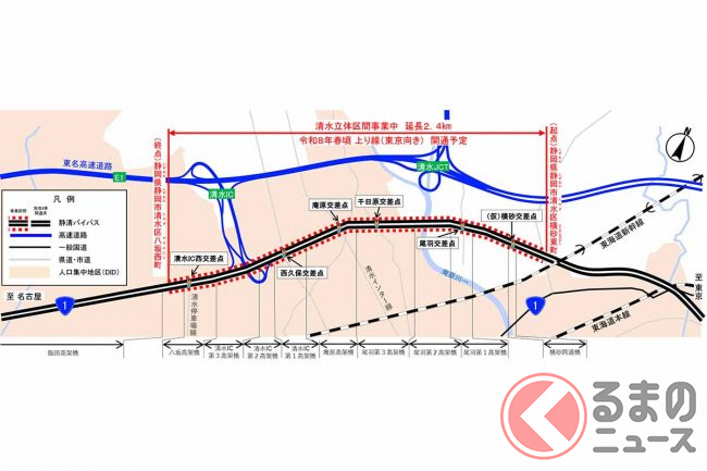 完成すると、平日朝ピーク時の興津IC~丸子IC間の所要時間は3~5分ほど短縮される見込みです。渋滞がより激しい上り(東京方面)の工事を優先して進めており、2026年春頃にまず上りが開通する計画でした。