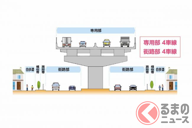 高架道路は設計速度80km/h・4車線、地上の街路部は設計速度60km/h・4車線で整備されます。