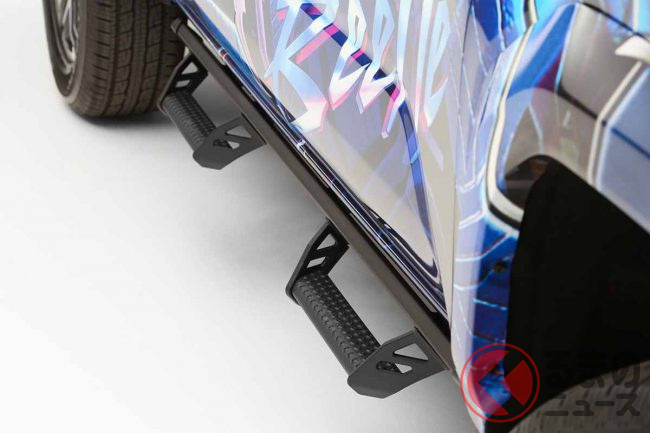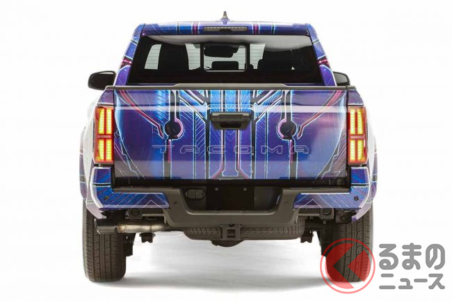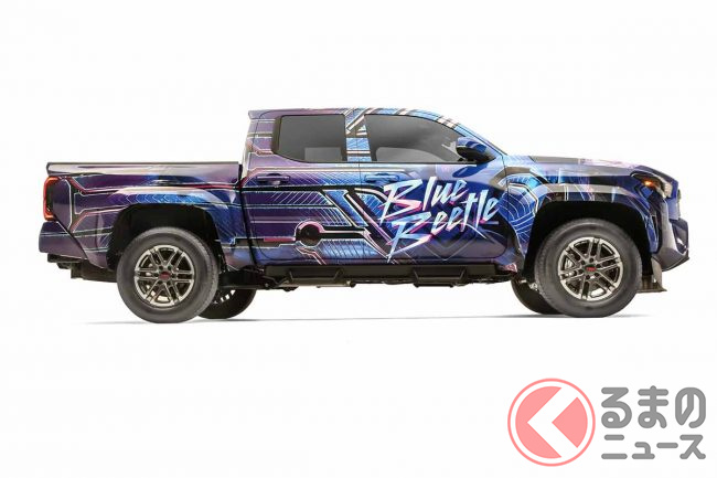 ベースは、最新の4代目タコマを採用。外観は、落ち着いた青をベースとしつつもピンクやマゼンダを散りばめることで、映画の「ブルービートル・スーツ」を連想させる鮮やかな色彩を再現しています。