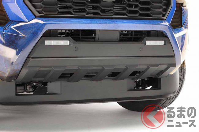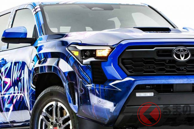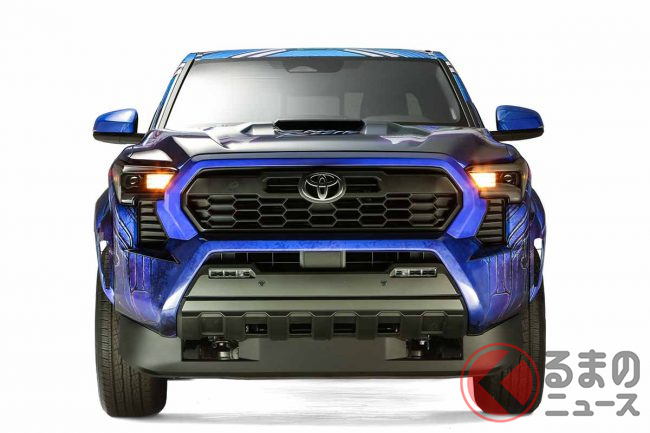 トヨタ新型「ド迫力巨大車」の“ヒーロー仕様”実車展示! 濃紺ボディがカッコいいカスタム「タコマ」米に登場