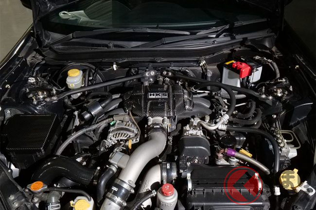 トヨタ「86」(ZN6)、スバル「BRZ」(ZC6)用の純正エンジンカバーを置き換えるドレスアップパーツの「HKS DRY CARBON ENGINE COVER ZN6/ZC6」は綾織カーボンを使用することで、エンジンルーム内の雰囲気を高級感ある見栄えにアップグレードできます。価格は3万9600円(税込み)です。