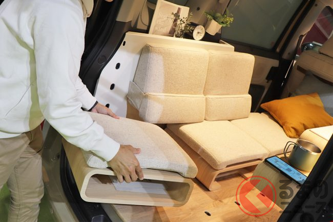 会場の担当者によると、クルマの移動先をリビングの「くつろぎ空間」としたり、仕事場代わりとなる「リモートワーク空間」とするなど、多彩に変化可能な点が特徴だと説明し、「車中泊」の利用も想定していると話します。