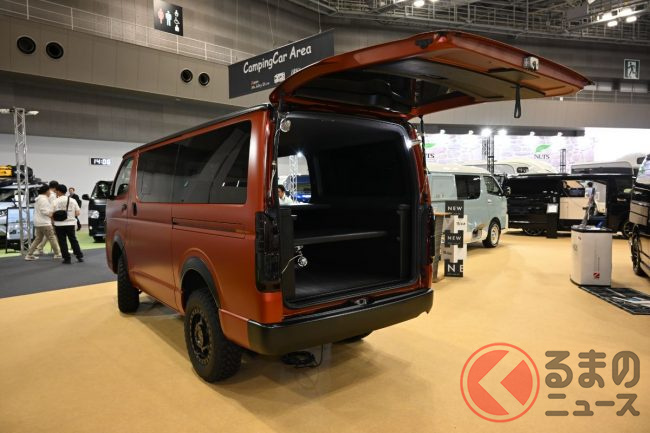 ジャパンモビリティショー2023では、さまざまなカスタムカーやコンセプトカーが展示されていましたが、なかでもキャンピングカーエリアで目を引いたのがコッパーオレンジのボディーカラーが光るハイエースの“シャコアゲ仕様”です。一体どのような特徴があるのでしょうか。