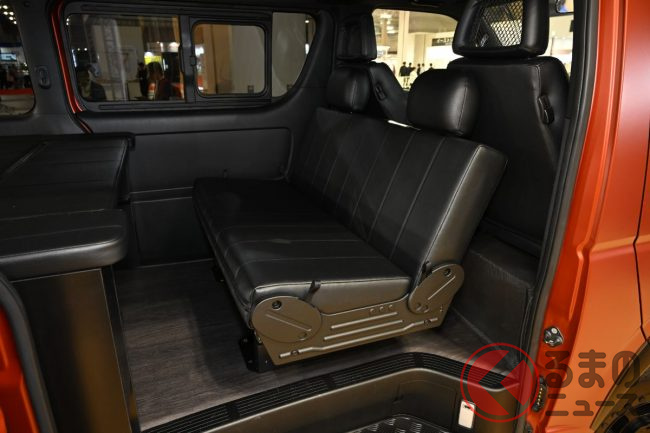 内装では、フラット仕様が可能な座席シートが備わっており、車中泊用のベッドとしての利用に加え、2段ベッド化も可能なほか、真ん中を机にして食事やワークスペースとしても利用できる仕様にできるといいます。