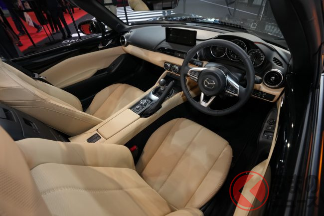 インテリアには8.8インチのセンターディスプレイを新しく採用。ライトウェイトオープンスポーツカーをほうふつとさせる内装とベージュ幌のカラーコーディネーションがラインナップに加わっています。