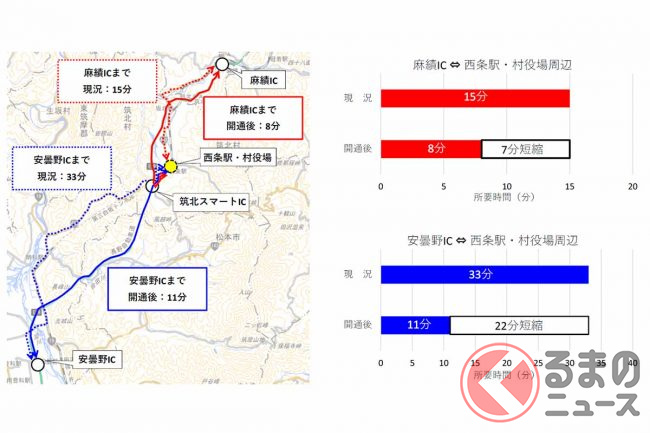 安曇野ICから麻績ICまでの距離23.2kmは、長野県内の高速道路ICの間隔として最長です。この区間はこれまで筑北村を通過していましたが、新たに開通する筑北スマートICによって、筑北村役場やJR篠ノ井線の西条駅から麻績ICまでの所要時間は15分から8分に、安曇野ICまでは33分から11分にそれぞれ短縮される見込みです。