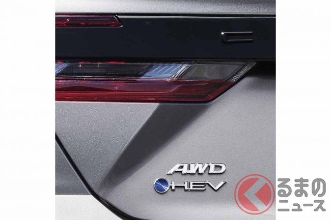 リア周辺を写したもので、テールライトなどのデザインが水平基調であることや、「AWD」「HEV」のエンブレムが付与され、ハイブリッドかつ全輪駆動のモデルが用意されることが分かります。