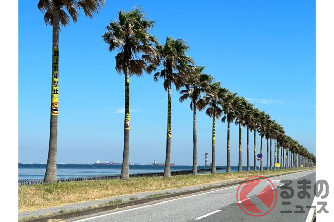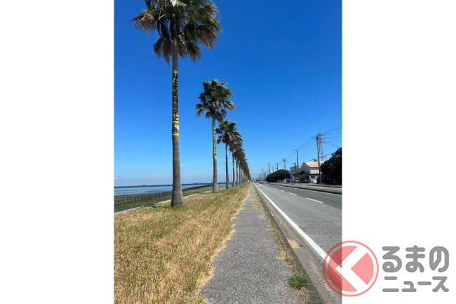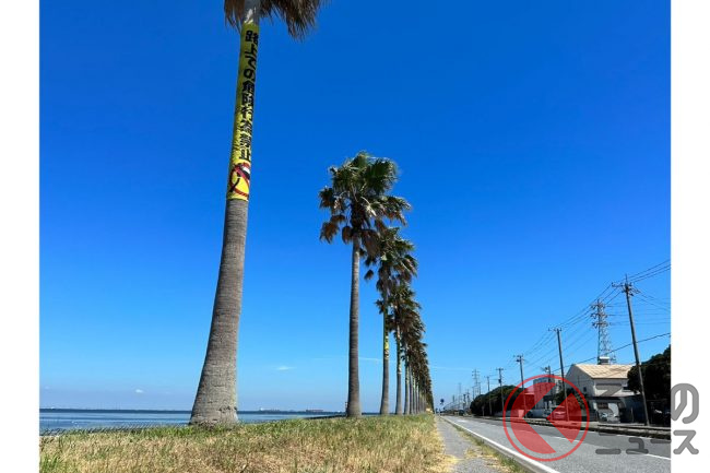 千葉県袖ケ浦市の市街地から袖ケ浦海浜公園に向かう海浜公園通り沿いには、約1kmほどかけて多くのヤシの木が立ち並んでいます。