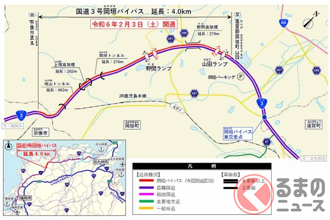国土交通省九州地方整備局北九州国道事務所は2023年11月17日、国道3号の岡垣バイパス(延長4.0km)が、2024年2月3日に4車線化すると発表しました。これにより、北九州市から福岡市にかけての全区間が、4車線化します。