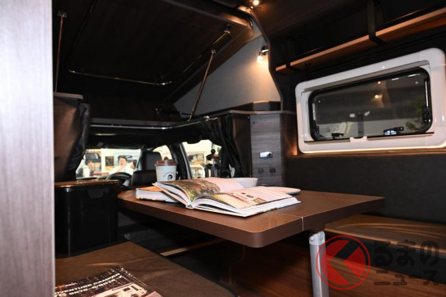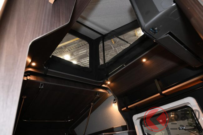 インテリアは、ベンチシートとテーブルがセットされているリビングスペースに加え、ポップアップルーフを上げれば大人が立って歩けるほどの広い室内空間が確保されています。