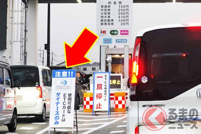 つまり、ほとんどのETCカードは対象外で、かつ停止が必要なため、料金所の手前には「使用可能なETCカードはダイナースのみ」「ETC車も一旦停止」「ETCでも料金所では一旦停止」と注意を促す看板が並びました。