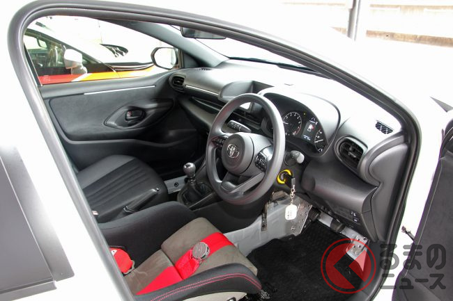 続いてのヤリスはGRではない通常の5ドアハッチバックモデルですが、ジムカーナ仕様ということで、内装のカーペットや遮音材は剥がされ、ジムカーナスペックの足回りと相まって非常にレーシーな乗り味です。