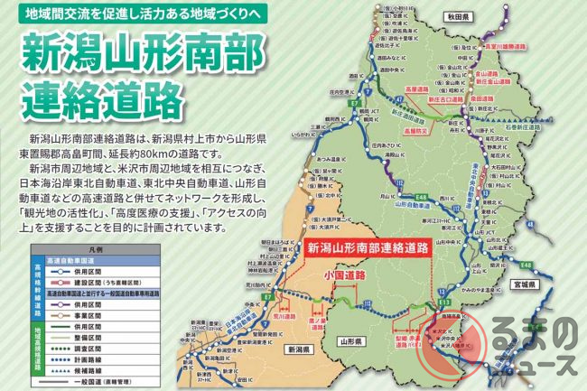 また、川西町では2023年度開通予定の国道113号バイパス「梨郷道路」(新潟山形南部連絡道路)と接続する計画もあります。これが実現すると米沢長井道路は、福島・米沢から村上・新潟方面へ向かう際の無料の近道となることも期待されています。