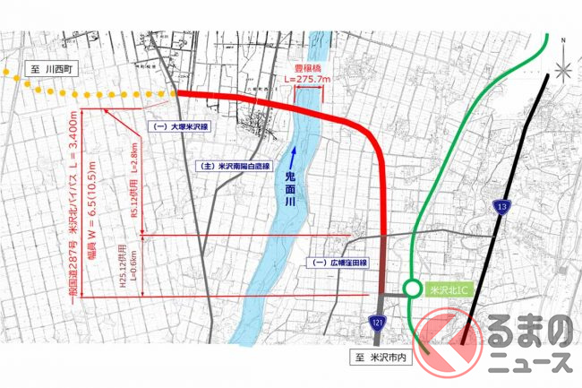 山形県米沢市で、国道287号「米沢長井道路」のうち、「米沢北バイパス」の区間が2023年12月2日14時に全線開通します。どのようなルートなのでしょうか。