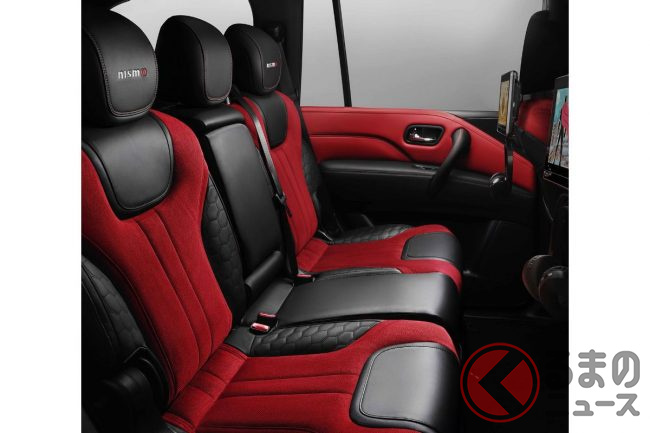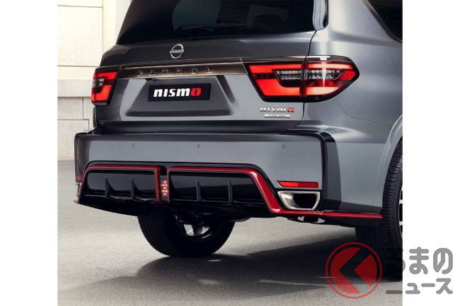 エクステリアは、フロントバンパーに設けられた大きな開口部や、ニスモで特徴的な赤のアクセント、リアバンパーのディフューザーが大型SUVとは思えないスポーティな印象です。
