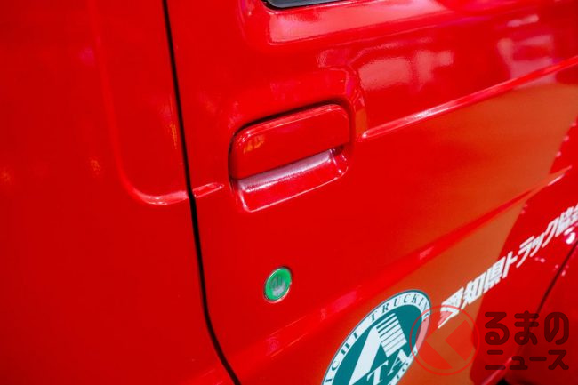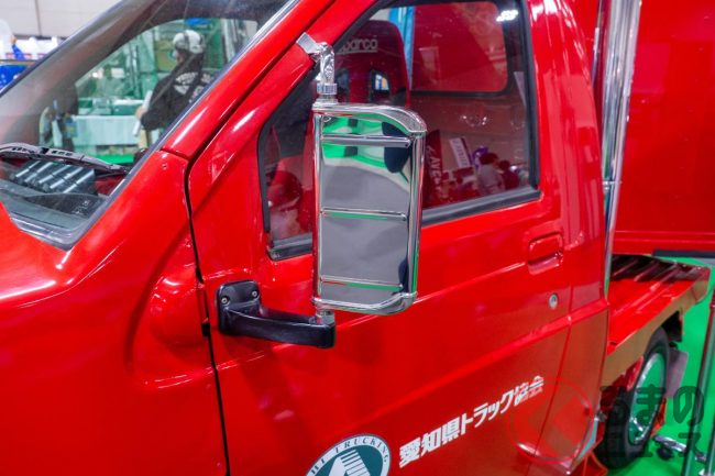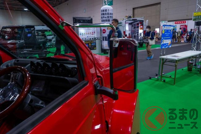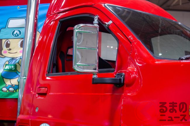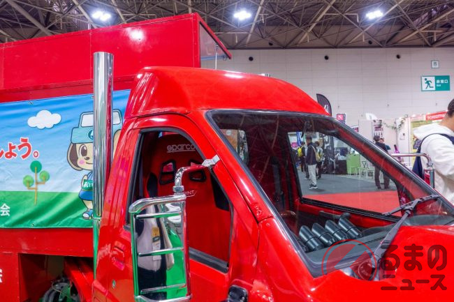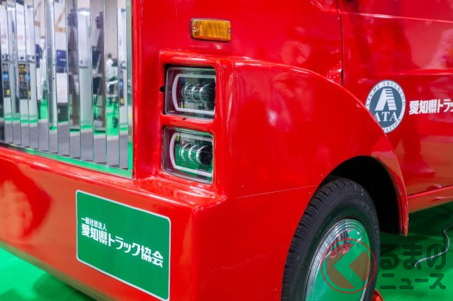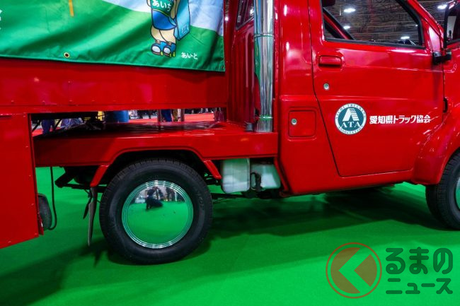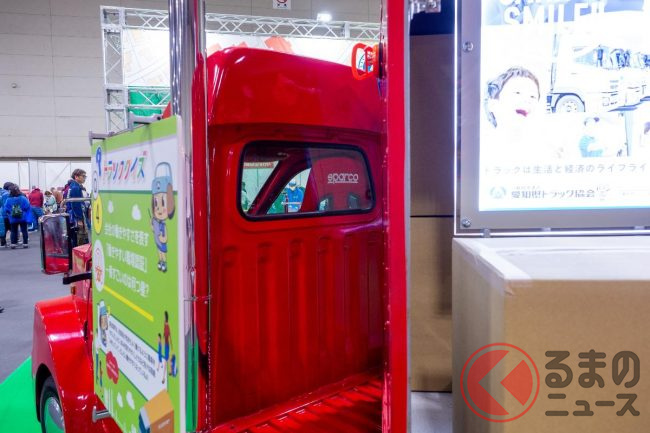 中でも異色な雰囲気を放っていたのが、愛知県トラック協会の展示していた真っ赤なトラック。フロントマスクなどはレトロなデザインの一方、内装にはレーシングシートを設置するなど、さまざまな改造が施されていますが、何と言ってもトレーラーにしては“非常にコンパクト”です。